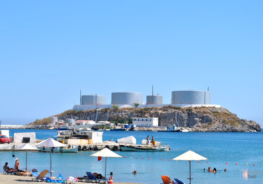 Στο πίσω μέρος των παραπάνω φωτογραφιών θα δείτε τις δεξαμενές ανεφοδιασμού καυσίμων της οικογένειας Βαρδινογιάννη, οι οποίες λειτουργούν εδώ και αρκετά χρόνια. Αν και αρκετά… καλογυαλισμένες, μάλλον δεν ταιριάζουν και τόσο πολύ με το φυσικό τοπίο. Αν και η ύπαρξη τους εκεί μπορεί εύκολα να προδιαθέσει κάποιον αρνητικά, η θάλασσα εξακολουθεί να είναι πολύ καθαρή και έτσι οι επισκέπτες είναι πολλοί.