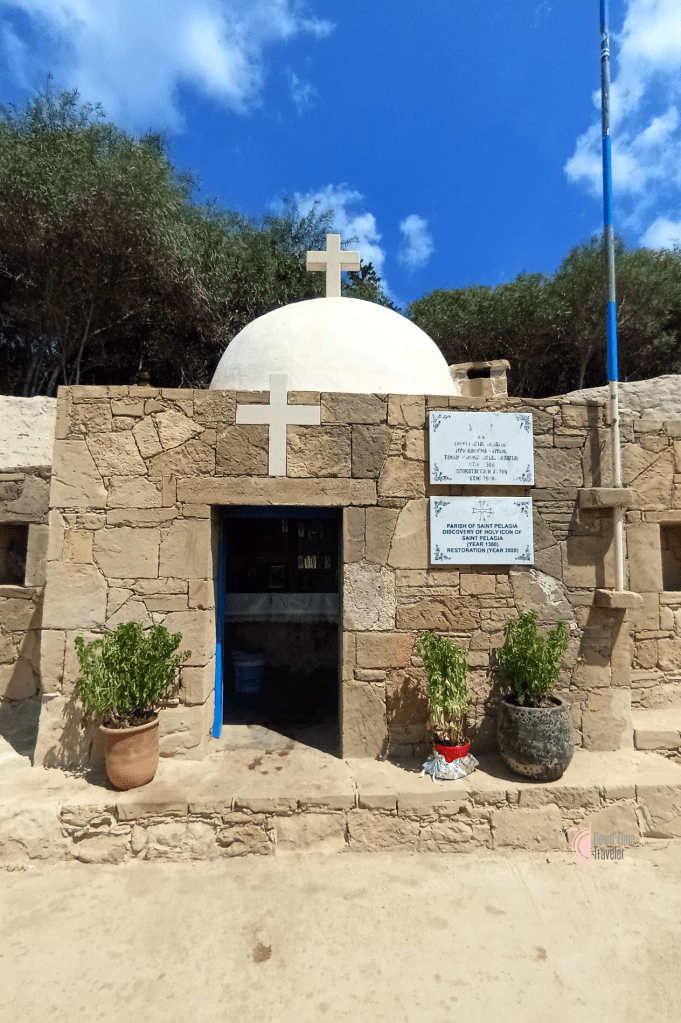 Στο βόρειο άκρο της παραλίας της Αγίας Πελαγίας βρίσκεται το ομώνυμο μικρό εκκλησάκι, γνωστό και ως «Ναός της Εύρεσης«, σύμφωνα με κάποιες πηγές, χτισμένο στο σπήλαιο όπου σύμφωνα με την παράδοση βρέθηκε η εικόνα της Αγίας με το καντήλι της. Αργότερα, στην περιοχή ιδρύθηκε η Μονή Αγίας Πελαγίας, που χρονολογείται στον 13ο αιώνα.