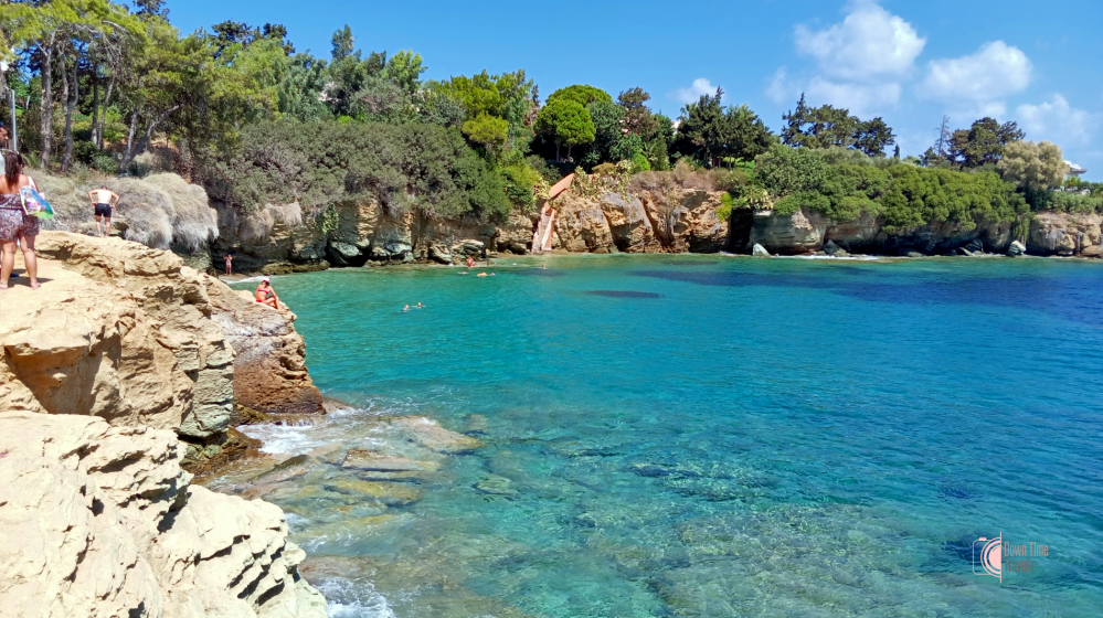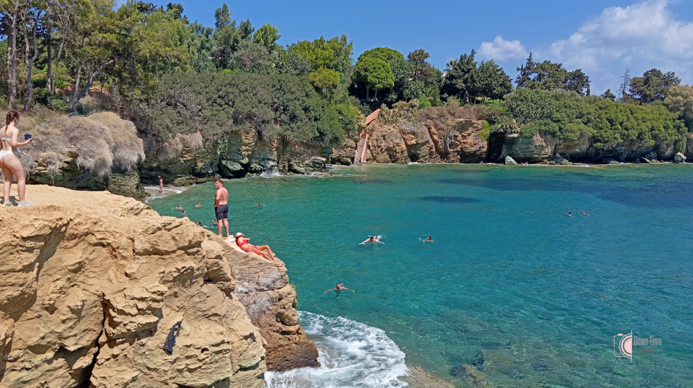 Ακολουθώντας το μονοπάτι που ξεκινά από το εκκλησάκι, με λίγη προσοχή – και κατάλληλα παπούτσια καλύτερα – θα βρεθείς στον ήσυχο Κλαδισός, έναν κολπίσκο με σμαραγδένια νερά και γαλήνια ατμόσφαιρα. Αν συνεχίσεις, σε περιμένουν οι Φύλακες, μια μικρή παραλία με πράσινα, διαυγή νερά, κρυμμένη ανάμεσα σε βράχια. Η πρόσβαση έχει τη δική της περιπέτεια: το μονοπάτι σταματά πριν το τέλος, περνάς πάνω από βράχια και ίσως χρειαστεί να μπεις στο νερό ή να κολυμπήσεις λίγα μέτρα.
