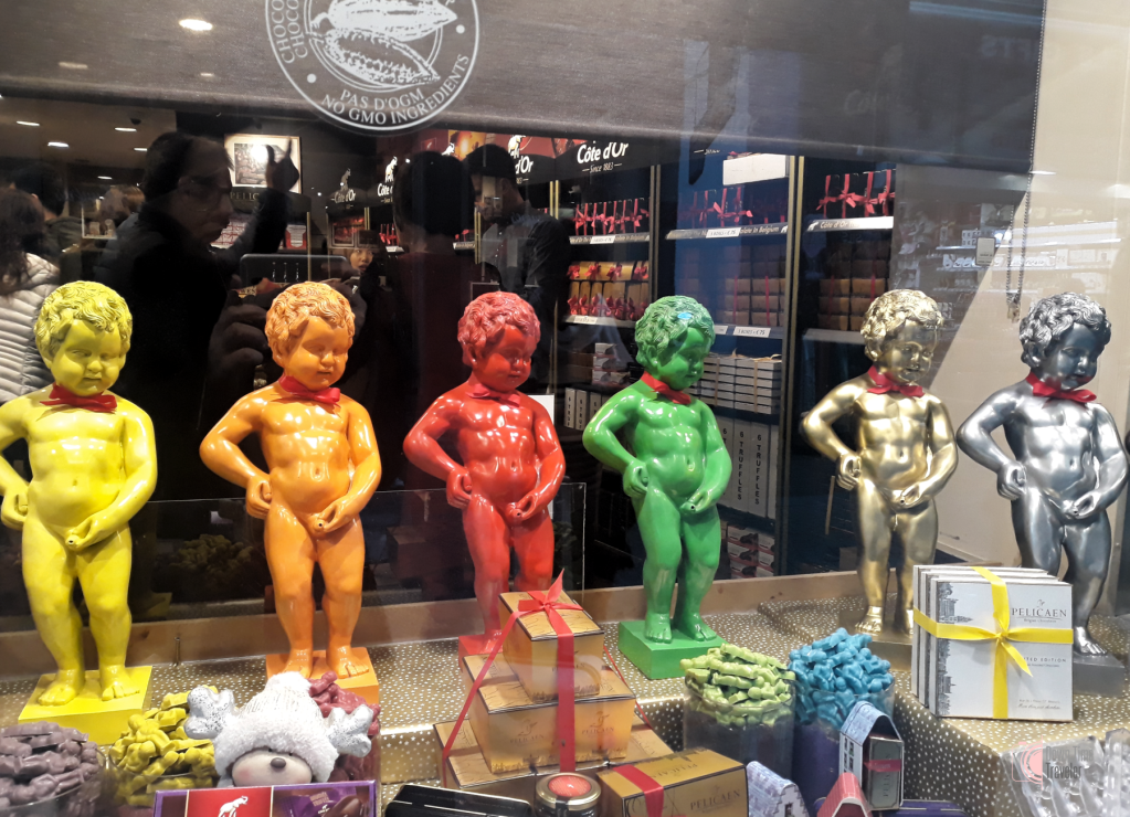 Τον Manneken Pis θα τον δείτε να φιγουράρει και σε πολλές βιτρίνες καταστημάτων γλυκών, στους δρόμους γύρω από την Γκραν Πλας. Επί τη ευκαιρία, ας πούμε μερικά λόγια και για τις γευστικές απολαύσεις που μπορεί να σας προσφέρει η πρωτεύουσα του Βελγίου.