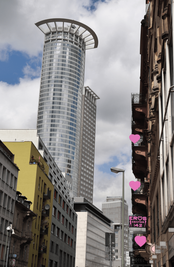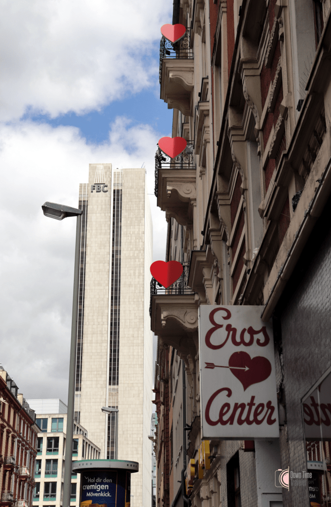 Ολοκληρώνοντας αυτό το άρθρο, αξίζει να γίνει αναφορά και στα λιγότερο φωτεινά σημεία της πόλης! Οι παρακάτω φωτογραφίες απεικονίζουν την άλλη πλευρά της Φρανκφούρτης, την σκληρή! Στην περιοχή, γύρω από τον οριοθετημένο πλούτο των μεγάλων τραπεζών, υπάρχουν πάρα πολλά «στέκια αγοραίου έρωτα«. Σε μία οδό λίγα μέτρα πιο πέρα από τις επιχειρήσεις, τις τράπεζες και τους ουρανοξύστες, ένας άλλος κόσμος γεννιέται. Προχωρώντας για λίγο, δεν μπορούσα να συνειδητοποιήσω ότι κοιτώντας μπροστά βλέπω… καρδούλες έρωτα, ενώ στρίβοντας το κεφάλι 180 μοίρες, τα μάτια μου έπεφταν και πάλι στους πολλά υποσχόμενους, όχι για όλους όμως, κολοσσούς του χρήματος! Και φυσικά το σκληρό αυτό τρίπτυχο των τεράστιων αντιθέσεων ολοκληρώθηκε με τους χρήστες και τα βαποράκια, σε αρκετά σημεία του δρόμου!