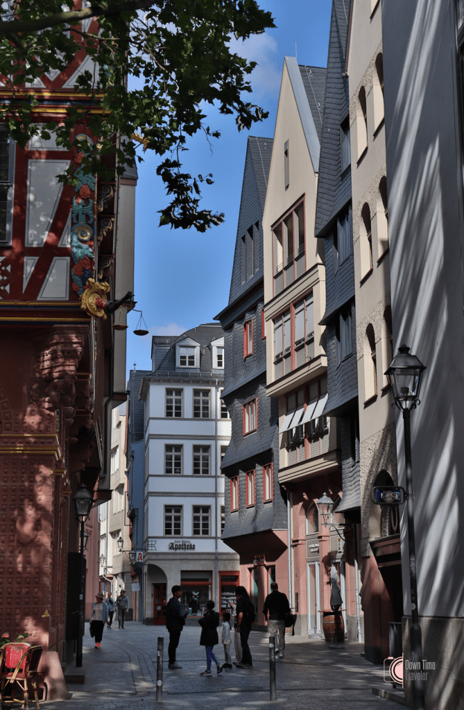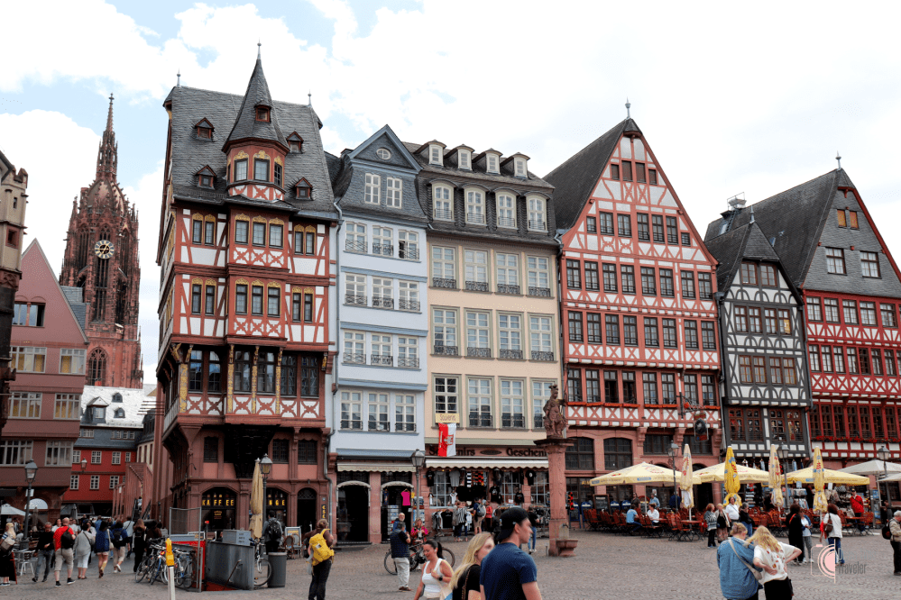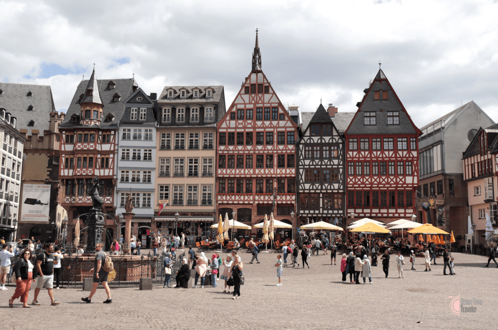 Η Κεντρική Πλατεία Römerberg: Εκεί που περπατούσες ανάμεσα στους επιβλητικούς ουρανοξύστες της Φρανκφούρτης, με το κεφάλι ψηλά να ακολουθείς το βλέμμα σου μέχρι την κορυφή τους, διασχίζοντας τον ποταμό μέσα από τις χαρακτηριστικές σιδερένιες γέφυρες, ξαφνικά βρίσκεσαι μπροστά στην πλατεία Römerberg. Η εικόνα της μοντέρνας μεγαλούπολης που είχες πλάσει στο μυαλό σου διαλύεται μονομιάς. Τα βλέφαρά σου γεμίζουν με την ομορφιά μιας άλλης εποχής. Τι υπέροχα κτίρια! Τι μοναδική αρχιτεκτονική! Τι ζωντανά χρώματα! Τι γραφική και πανέμορφη πλατεία! Πόσο έντονα ξεχωρίζει από όλα όσα είχες δει μέχρι τώρα. Είναι σαν μια ζωντανή ανάσα ιστορίας μέσα στη μοντέρνα πόλη.