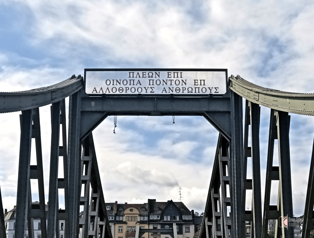 Είδατε ελληνική επιγραφή στην παραπάνω φωτογραφία, αλλά θεωρείτε ότι κάποιο λάθος έγινε στην ανάρτηση ή ότι ίσως εσείς δεν βλέπετε καλά; Όχι, κανένα λάθος δεν συνέβη και τα ματάκια σας λειτουργούν υπέροχα! Ναι, είναι αλήθεια! Οι Έλληνες επισκέπτες, καθώς θα κάνουν την βόλτα τους στο ποτάμι και όσο περισσότερο πλησιάζουν στην Σιδερένια Γέφυρα, θα βρεθούν αντιμέτωποι με μία ευχάριστη έκπληξη!!! Στο κέντρο λοιπόν του οικονομικού πυρήνα της Γερμανίας (Γερμανικό χρηματιστήριο, Ευρωπαϊκή Κεντρική Τράπεζα, Deutch Bank κ.α.) ένα κομμάτι της αρχαίας ποίησης του Ομήρου ξεπροβάλλει!